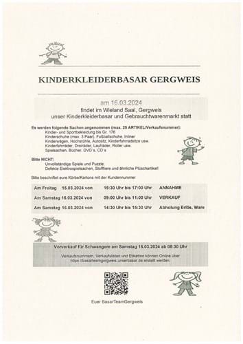 Verkaufsnummern, Verkaufslisten und Etiketten können ab 15.Januar per Mail unter https://basarteamgergweis.unserbasar.de erstellt werden.